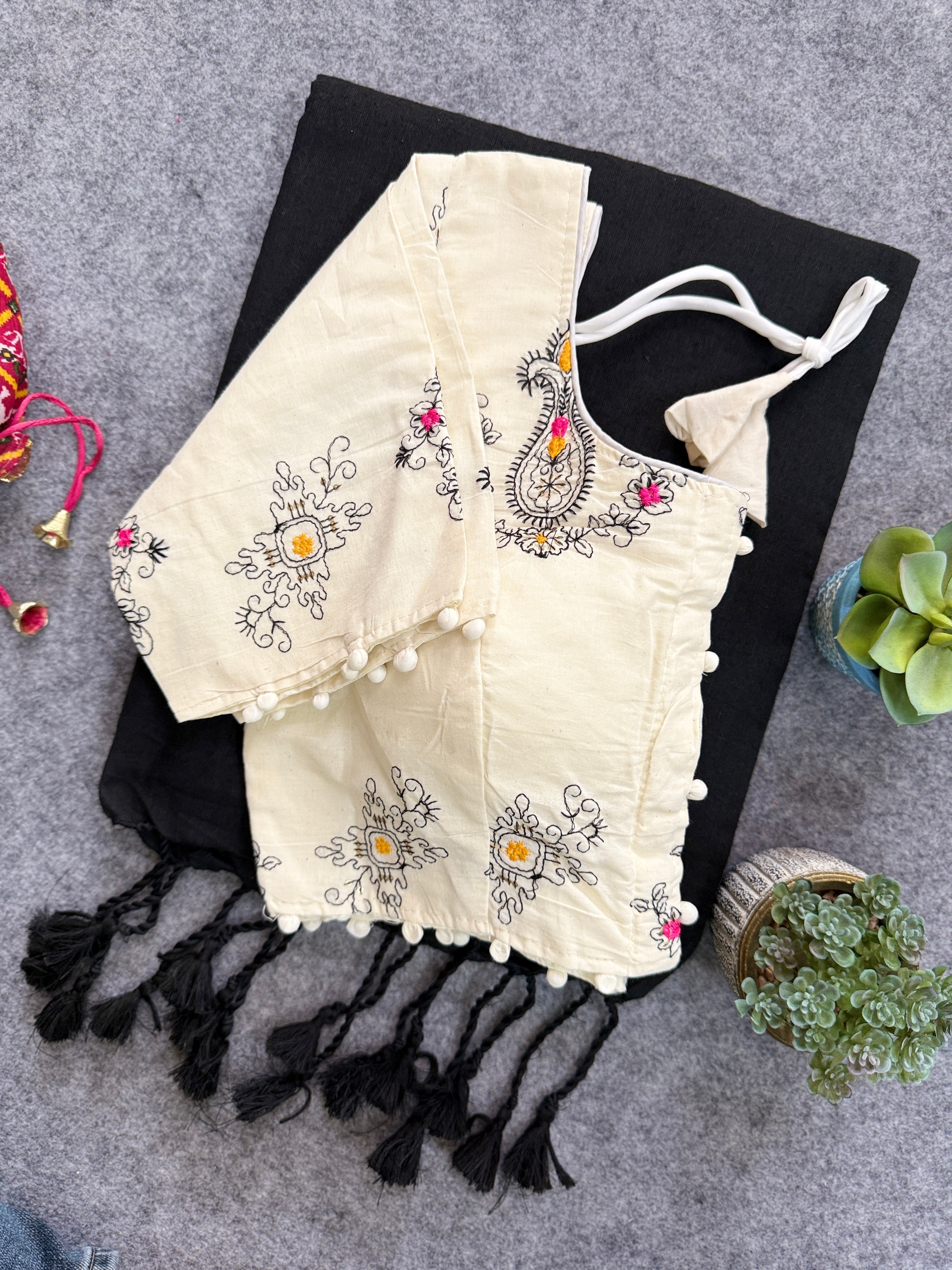 Black Handloom Cotoon Saree With Embrodry Work Stitched Blouse