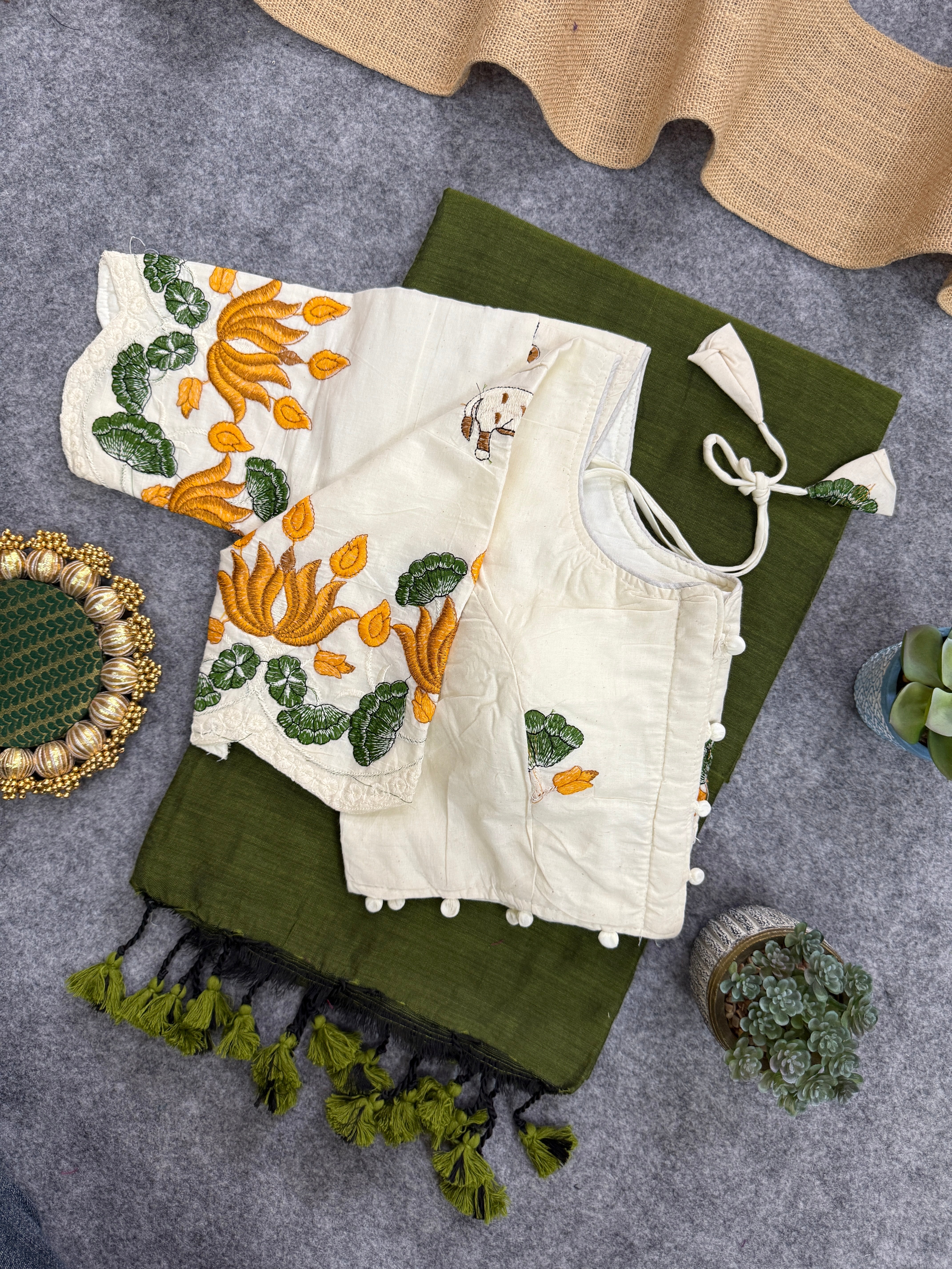 Embrace tradition with a modern touch in this Handloom Khadi Cotton Saree. Its natural handloom texture reflects authenticity, while the stitched blouse adds convenience. From everyday wear to festive gatherings, this saree ensures timeless beauty.