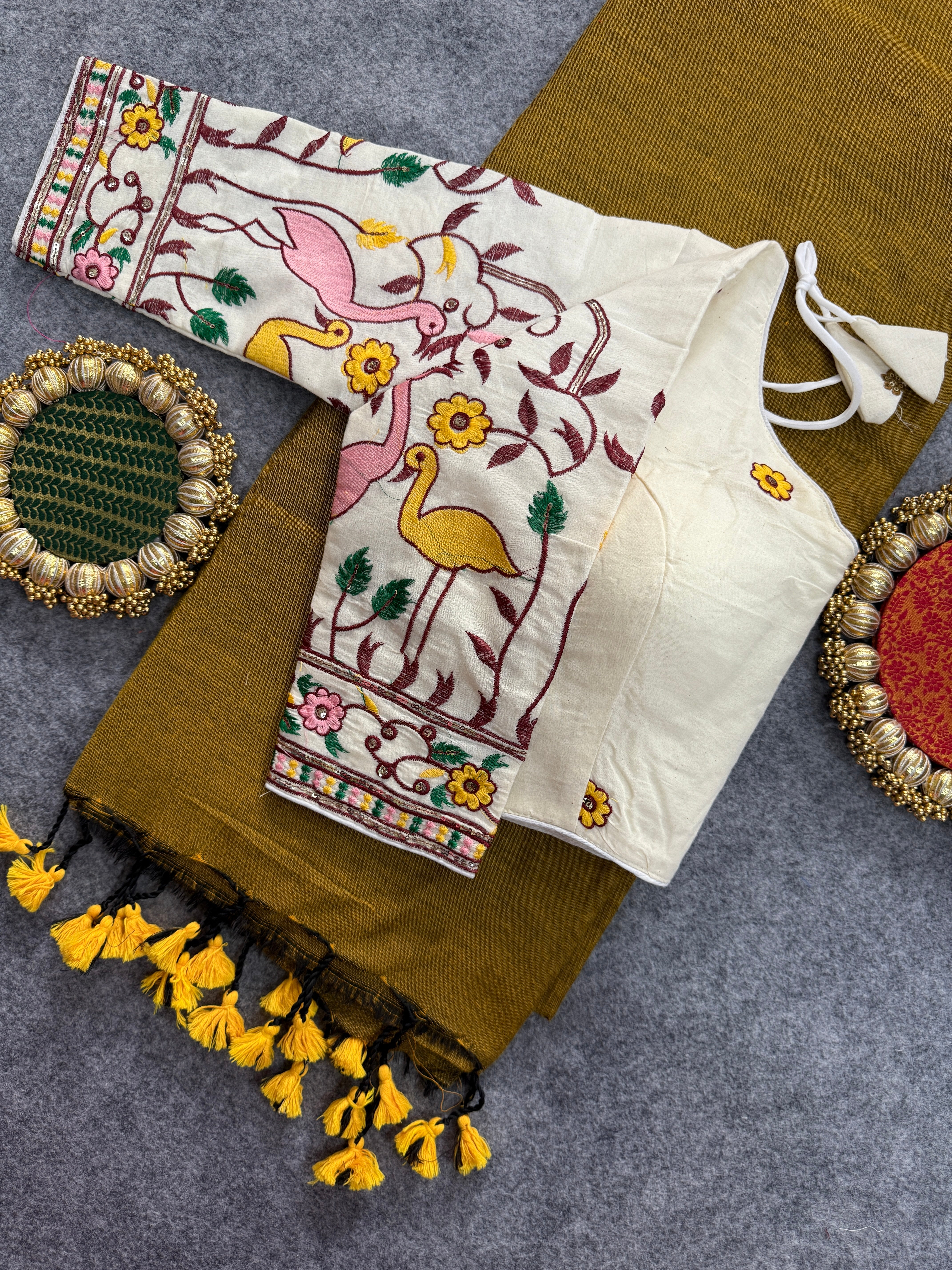 Golden Handloom Cotoon Saree With Embrodry Work Stitched Blouse