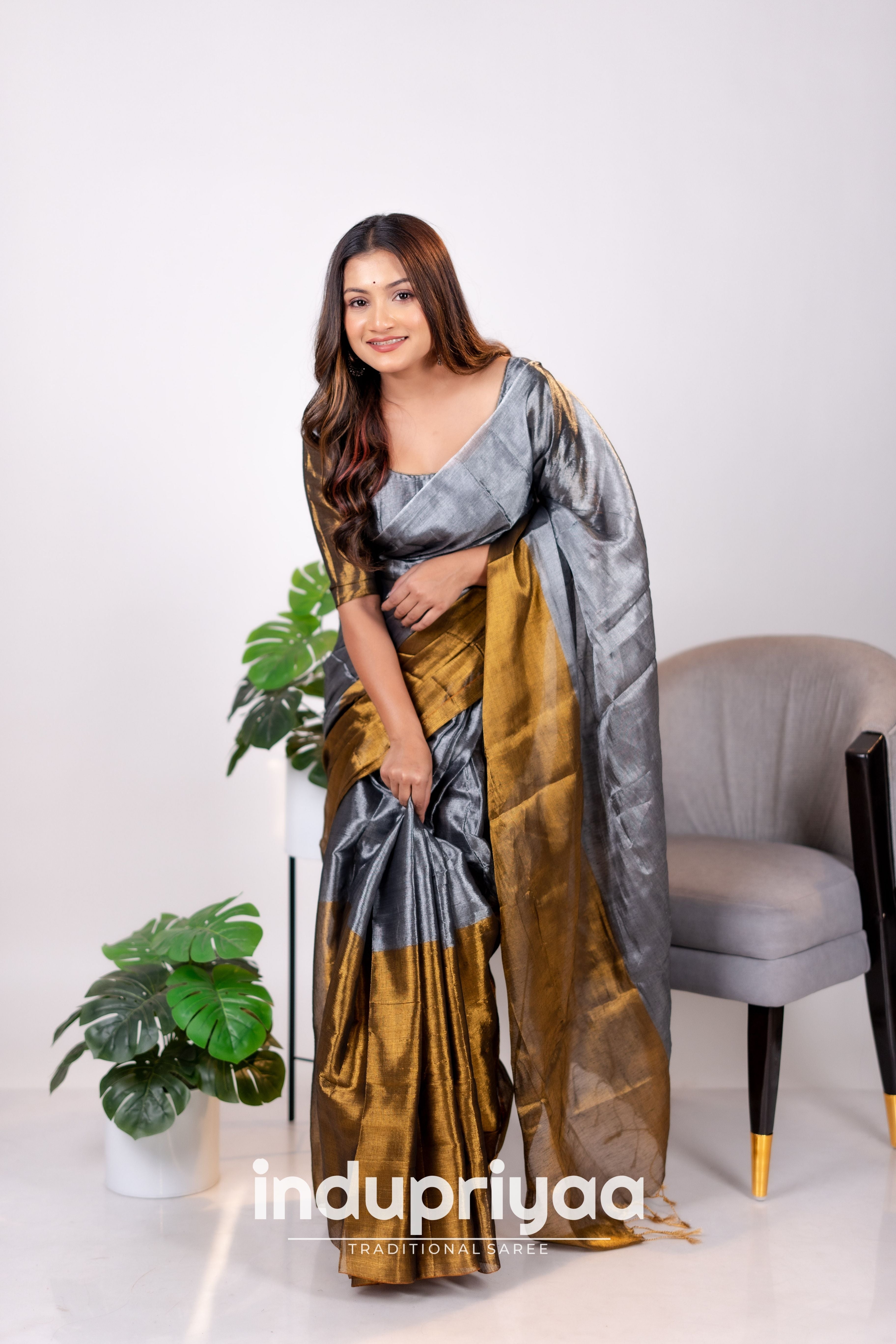 Indupriyaa Gold Nd Grey Designe Handloom Tissue Cotton Saree